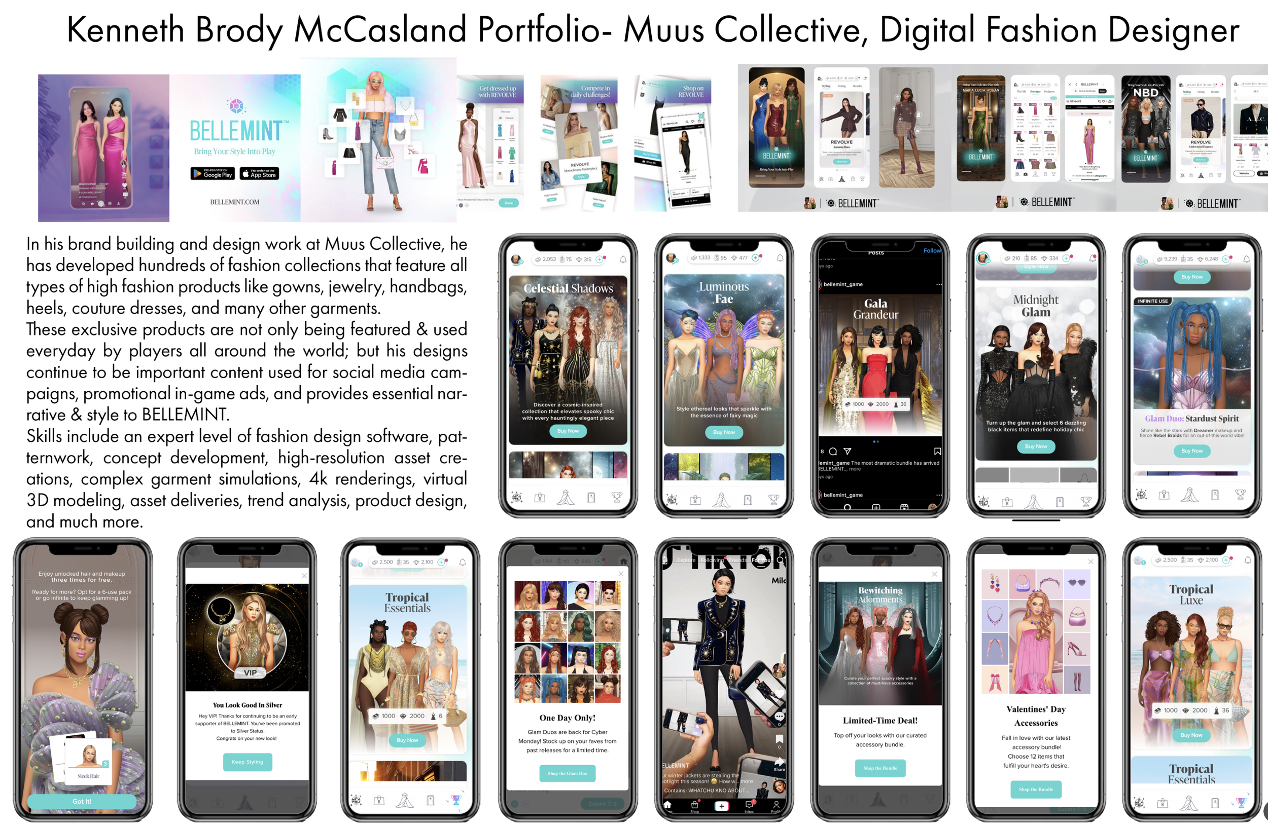 In 2023 Kenneth Brody joined the talented team at Muus Collective, a fashion centric entertainment studio. Here he worked as Digital Fashion Designer and was integral to the development of BELLEMINT, a new immersive fashion mobile game. In his brand building and design work at Muus Collective, he has developed fashion collections that feature all types of high fashion products like gowns, necklaces, handbags, heels, couture dresses, headdress, earrings, and many other garments.